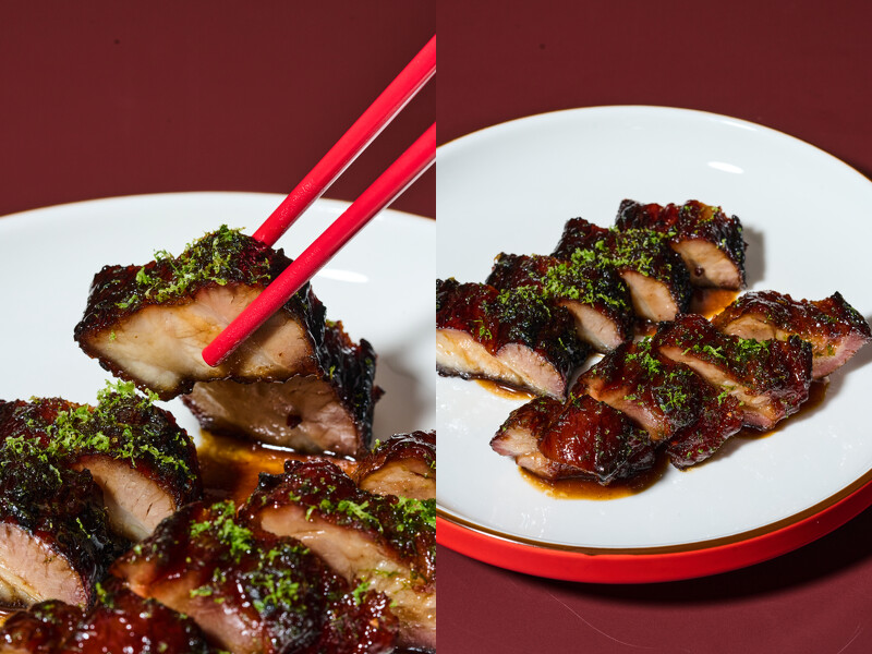 港式叉燒大致可分為兩種風格,一種是常見的蜜汁叉燒,另一種則是如今在香港也較少見的黑叉燒。「三點三」以雙拼方式呈現兩種作法。蜜汁叉燒選用豬梅花,油花分布均勻,口感柔嫩,甜鹹比例控制得宜。黑叉燒則使用豬五花,脂肪層次較為豐富,風味厚實。兩者在醃製與烘烤方式上各有不同,黑叉燒先以薑蔥、香料與叉燒醬醃製,再經掛爐烘烤,透過不同溫度控制,使外層形成焦香口感,同時保留肉質濕潤。蜜汁叉燒則著重於光澤與多汁度,切面清楚,入口不顯甜膩。雙拼搭配,更能同時感受到叉燒在香氣與口感上的差異。
