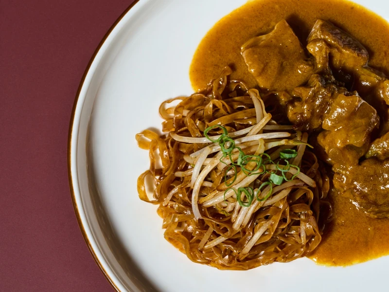 港式撈麵首重醬汁要均勻附著在麵條上,盤面保持乾爽,風味才會清楚。主廚選用自香港麵廠訂製的粗麵,麵體彈性佳,能確實帶出醬汁味道。咖哩以多種香料慢炒作為基底,再加入牛腩與牛筋滷至軟嫩,最後與麵條拌勻。入口時咖哩香氣集中,牛腩柔軟,牛筋帶有膠質卻不黏口。建議先品嚐原味,再視個人喜好加入紅醋調整,風味層次會更明顯。