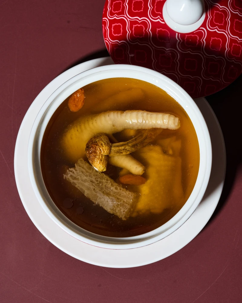 港式湯品中講究的是湯色清澈、味道不淡,並得保留食材本身的風味。選用土雞腿,搭配姫松茸、螺頭與竹笙等乾貨,放入燉盅中以小火慢燉。燉煮過程全程密封,不開蓋,以鎖住香氣,使湯體保持清透,油花細緻。入口時能感受到雞肉與乾貨自然融合的鮮味,風味集中卻不厚重,尾韻帶有淡淡的甘甜,呈現港式燉湯一貫的清爽與平衡。