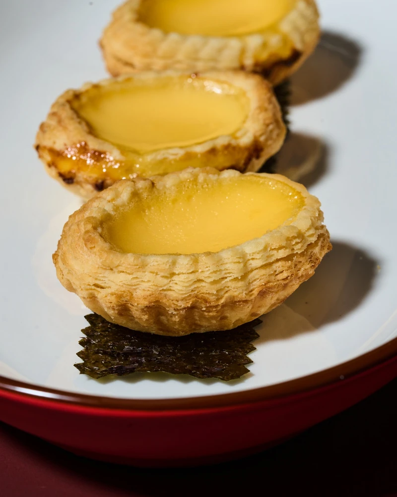 從蛋撻就能看出主廚的「基本功」,因為外皮得乾爽分明、蛋餡要滑順而不甜膩。主廚以水皮與油皮反覆摺疊製成,烤後外層酥脆,層次清楚。內餡以土雞蛋與牛奶調製,蛋香明顯但不厚重,出爐時控制在適中的熟度,讓內部保持柔滑口感。入口時能同時感受到酥皮的香氣與蛋餡的細緻,是結構簡單、表現穩定的經典甜品。