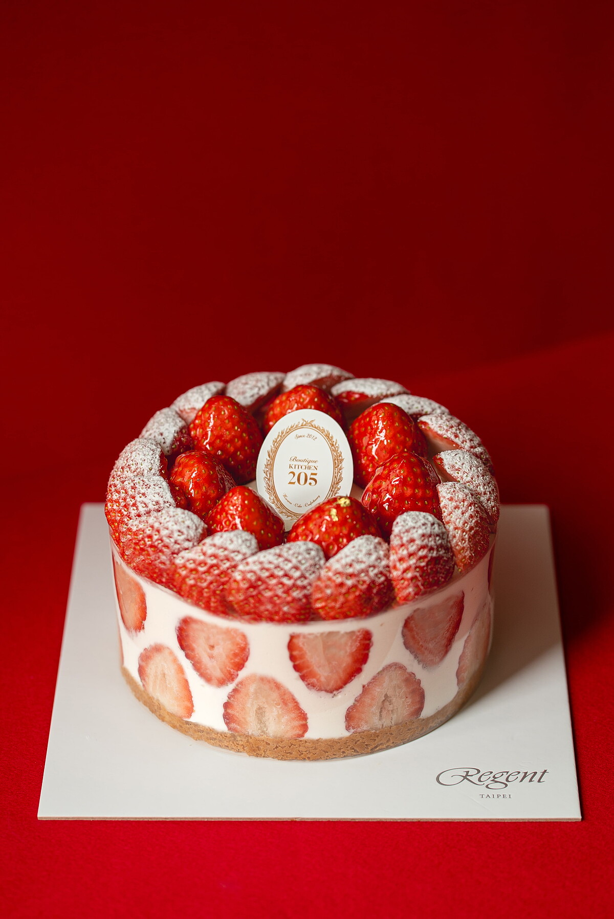 不像一般印象中的草莓蛋糕外層有厚重糖霜或鮮奶油,KITCHEN205的「裸感草莓蛋糕」很直接地讓草莓成為主角,整顆蛋糕中含40顆完整的新鮮草莓,和鮮奶油與蛋糕體層層堆疊,不用切開,一眼就看見滿滿的草莓盛宴,鮮豔的深紅色澤與白色 Cream 體形成乾淨俐落的對比,視覺上帶著高級精緻感,入口時,濃郁奶香交織著明亮、酸甜的天然草莓香,每口都充滿了幸福。