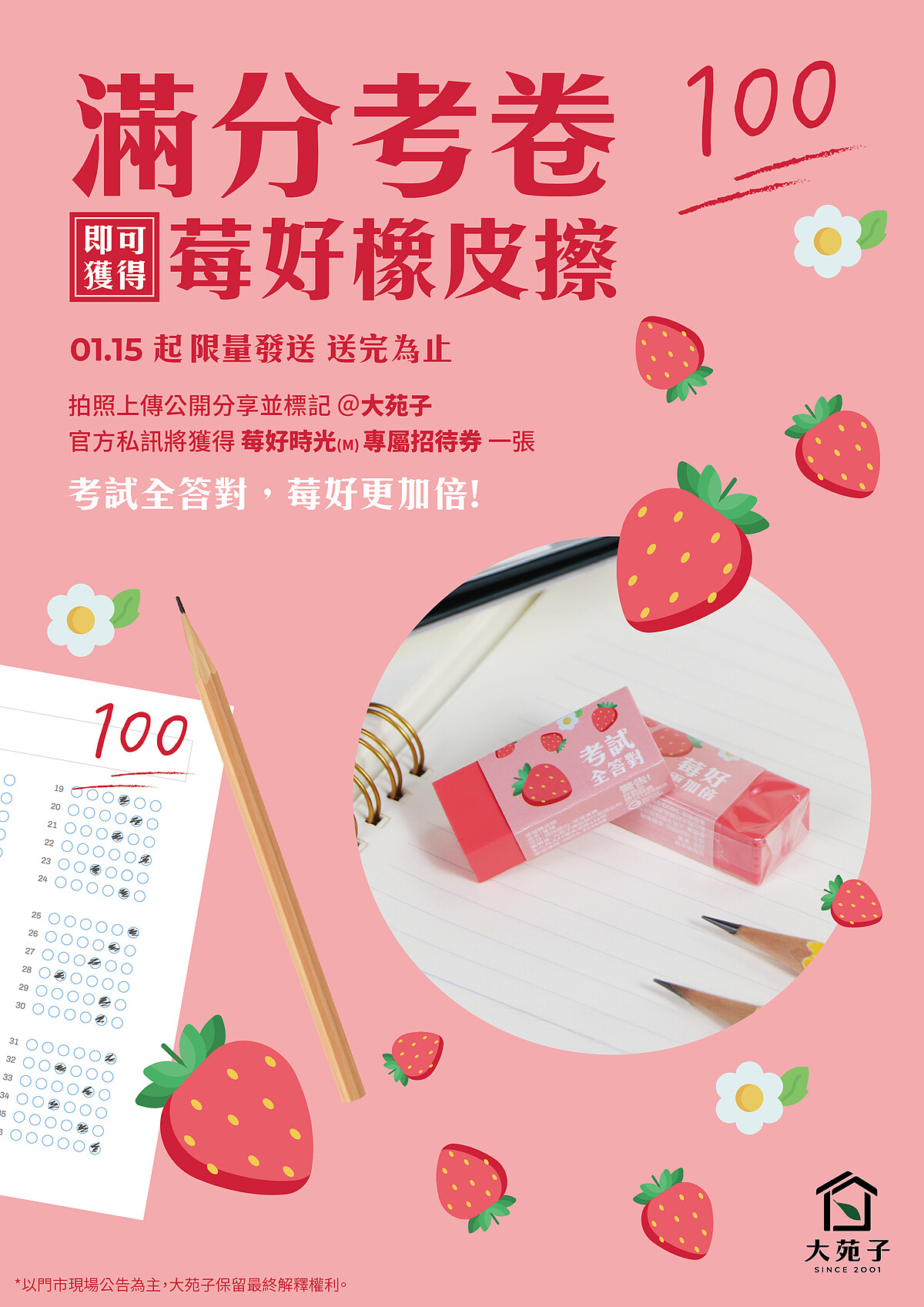 第一波活動自1/15起於全台門市展開,大苑子推出的「滿分應援」活動,凡持100分考卷即可兌換限量「莓好橡皮擦」,並於社群分享標記官方帳號,即可獲得「莓好時光」中杯招待券,藉由溫馨小巧思,陪伴家庭分享孩子努力後的成就感。