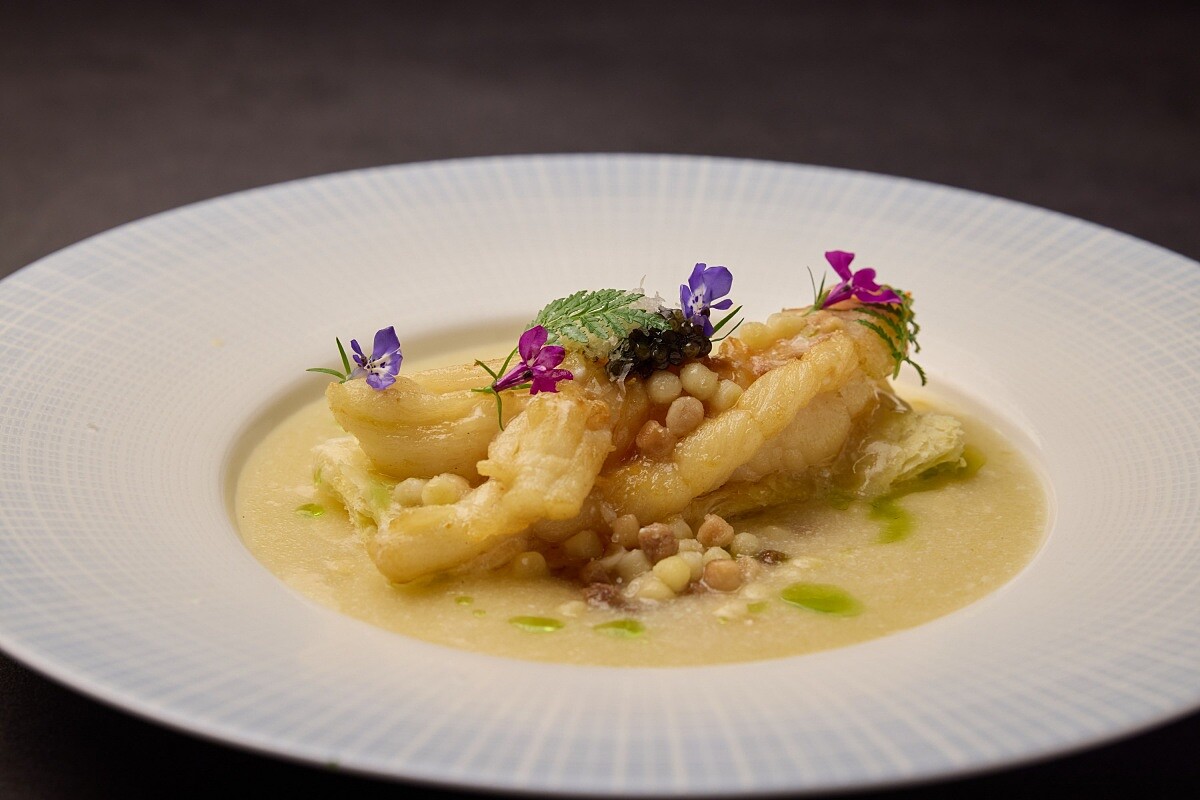 「師承之味.傳奇盛宴」以八道全熱食套餐呈現,回應歲末時節對溫度與飽足感的期待。從點心三拼開始,三款港點各自承載不同記憶與技法:以香港經典功夫菜為靈感的小籠包,將乳鴿與魚翅的鮮味濃縮於一口之中;蝦餃取材自鄺啟明在曼谷工作的經驗,運用羅氏蝦與蝦湯皮凍,強化層次與口感;燒賣則以台灣粉肝的細緻質地,重新詮釋熟悉的庶民點心。