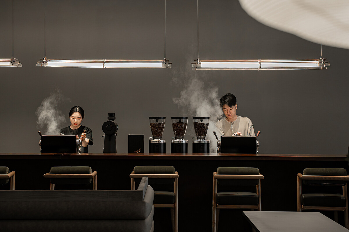 水湳門市由不醒人室內裝修操刀,以方格地磚建立理性秩序,長型吧檯結合外露管線與沉穩木作,形塑上輕下重的視覺比例。森林綠絨面吧檯椅與抱枕柔化金屬家具的線條感,燈光選用台灣設計品牌柒木的紙燈籠吊燈,溫潤光線讓人一坐下來便自然放慢節奏和心情。大面積玻璃引入礫石小徑與綠意景觀,形成室內外相互呼應的都市綠洲。空間透過分區與色彩語彙,讓Phase Coffee的沉穩基調中,自然融入DUM DUM的活潑元素。木質、灰色混凝土與橘綠亮色系在同一場域中取得平衡,空間本身成為雙品牌共創的一部分。