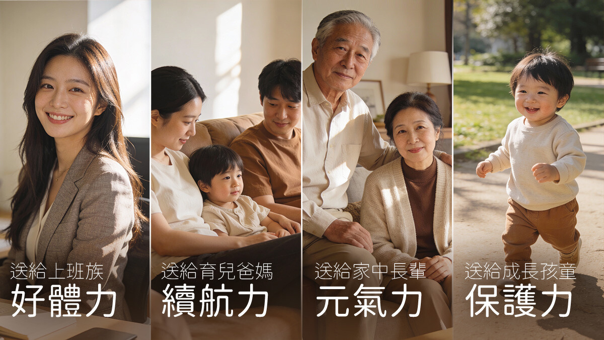 過年送禮,其實是替生活裡重要的人,多著想一點點。讓每天忙碌奔波的上班族補充「好體力」;為白天上班、晚上育兒的爸爸媽媽提升「續航力」;也替年紀漸長的長輩守住精神好的「元氣力」;更支持跑跑跳跳的孩子一份「成長力」!