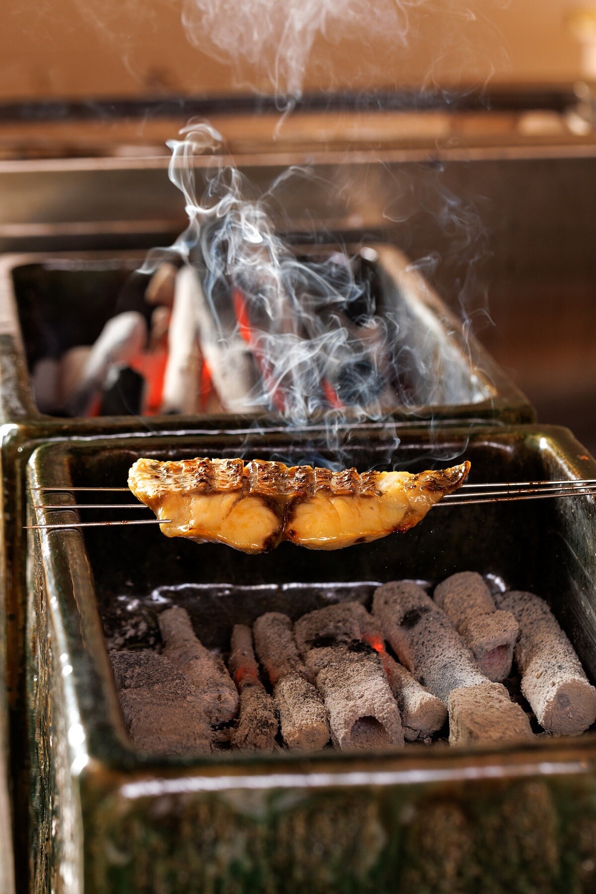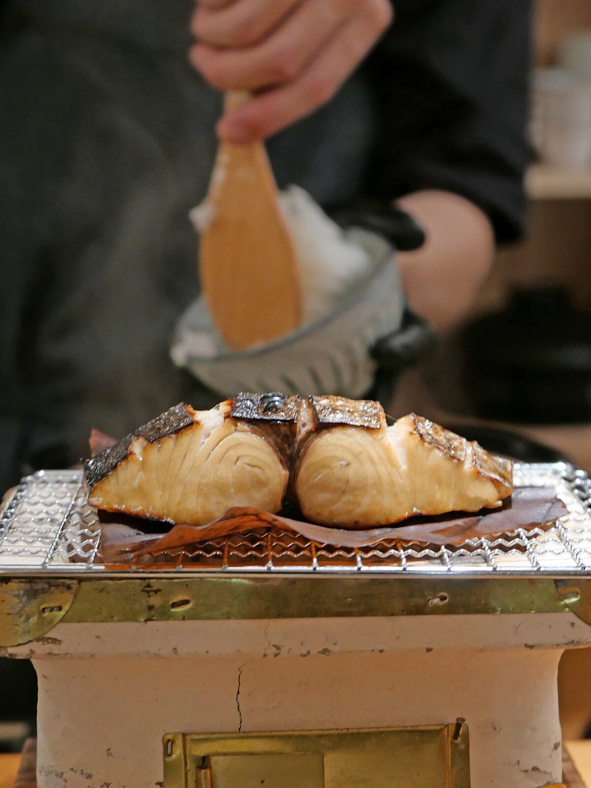 「朝炭」的空間沿用過去集團板前壽司餐廳的設計,僅有十席板前座位。視線自然被拉向中央的烤爐,加上兩口雲井窯飯鍋,每天準時清晨點火,備長炭鋪滿爐膛,火力穩定而內斂。Eden 則親自站在爐檯前翻轉魚身,沒有多餘動作,只有對火候的專注。魚皮在高溫下迅速定型,油脂滴落炭面,激起淡淡白煙,其香氣讓人食慾大開。