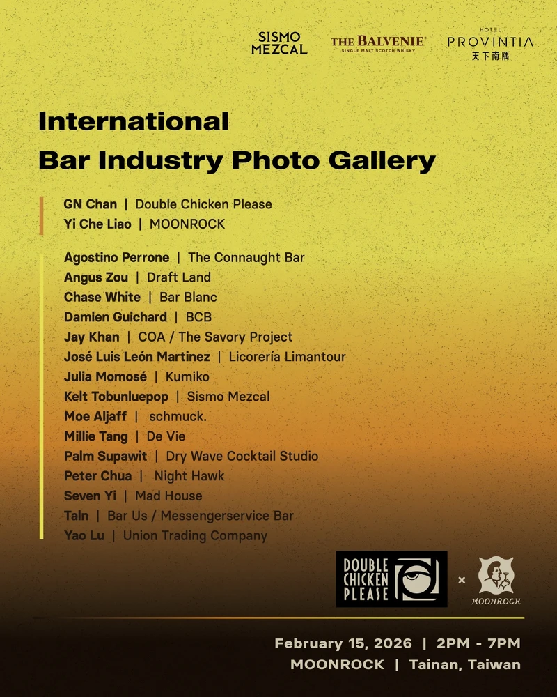 這場名為《DCP Portrait Studio & Gallery》的企劃,最早在2024年美國調酒產業盛會 Tales of the Cocktail(TOTC)亮相並引起轟動。2026年2月15日,這場源自國際頂尖舞台的實驗將登陸台南,人氣酒吧「MOONROCK」將暫時停止供應常態酒單。發起者紐約傳奇酒吧 Double Chicken Please (DCP) 邀請當代最頂尖的調酒師們集體放下雪克杯,拿起相機,要在這棟台南老屋裡,帶來一場關於光影、調酒與「你」的限時實驗。