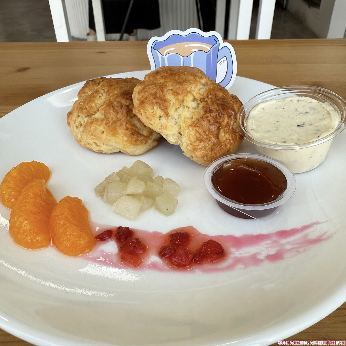 司康搭配草莓果醬與乳酪抹醬,帶來熟悉又溫暖的甜點風味。