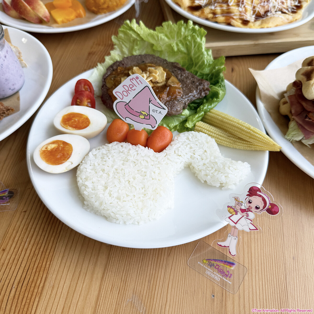 以蒜香牛排搭配溏心蛋、番茄、玉米筍與可愛音符造型白飯呈現DoReMi的俏皮與努力精神。