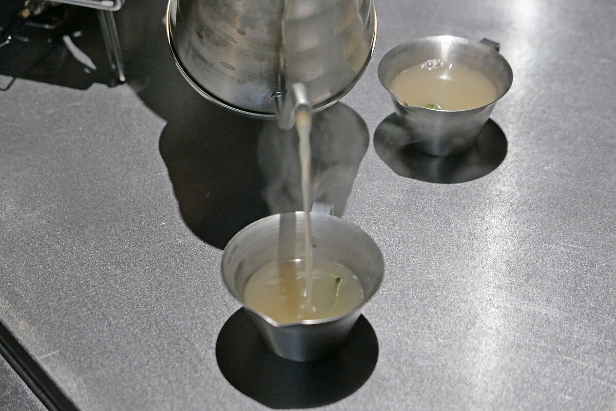 使用飛魚乾、蛤蠣煮成湯汁,杯中則有風乾、濃縮風味的刺蔥,將滾燙的高湯沖入杯中一起享用。