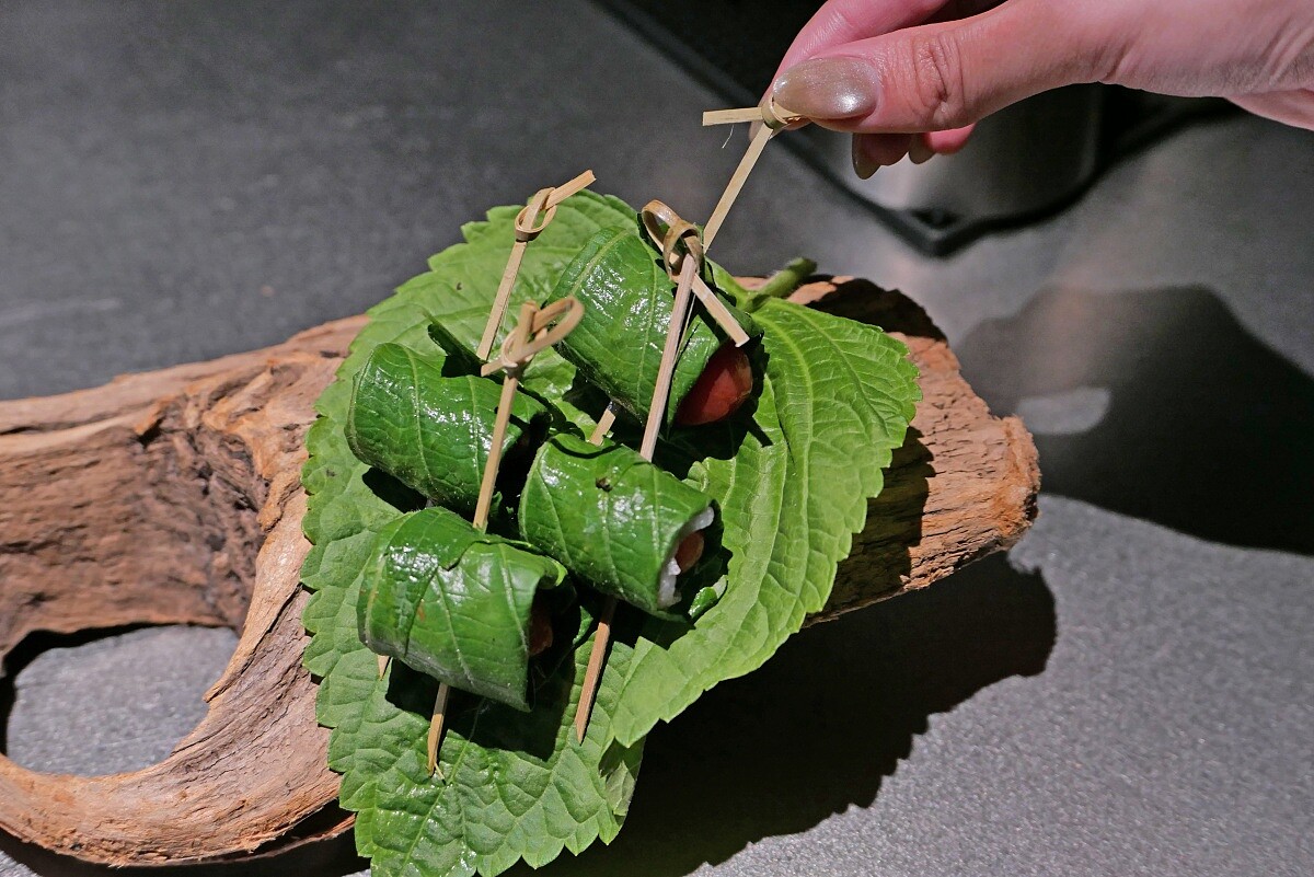 在阿美族豐年祭的時候,性會把「檳榔」當作定情的信物,放進男生配戴的情人袋裡。為了呈現檳榔這個意象,團隊以韓國芝麻葉替代荖葉,包裹進醃漬的番茄、旗魚、酸筍以及酥炸的小米,作為風味上的轉換與表現。