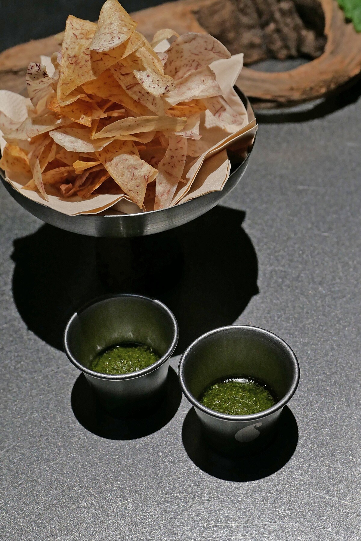 使用香椿、刺蔥、昭和草加入葡萄籽油做成沾醬,搭配上酥炸的芋頭片,用以搭配、呼應一旁的特調,希望在味道上能夠形成一個延續。