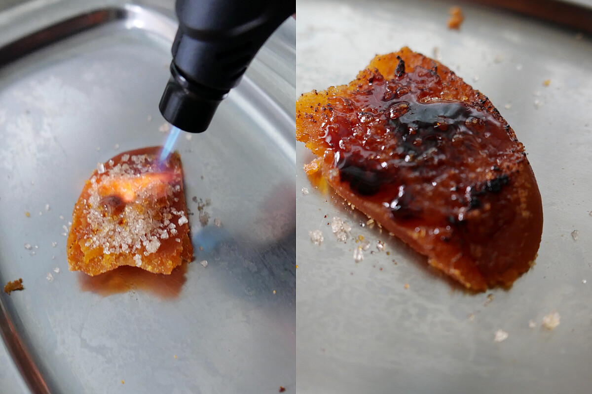 在切片的烏魚子上鋪上糖,以噴槍直火炙燒,讓糖變成酥脆的糖衣,焦香跟海味結合成超新奇的口感。
