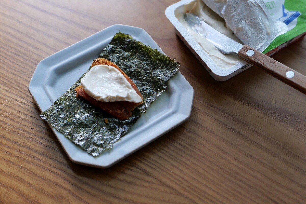 切片烏魚子上抹上等分量的 Cream Cheese,用海苔包起來一起享用,味道超級柔和。