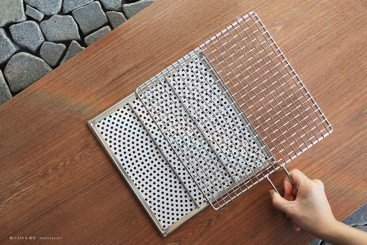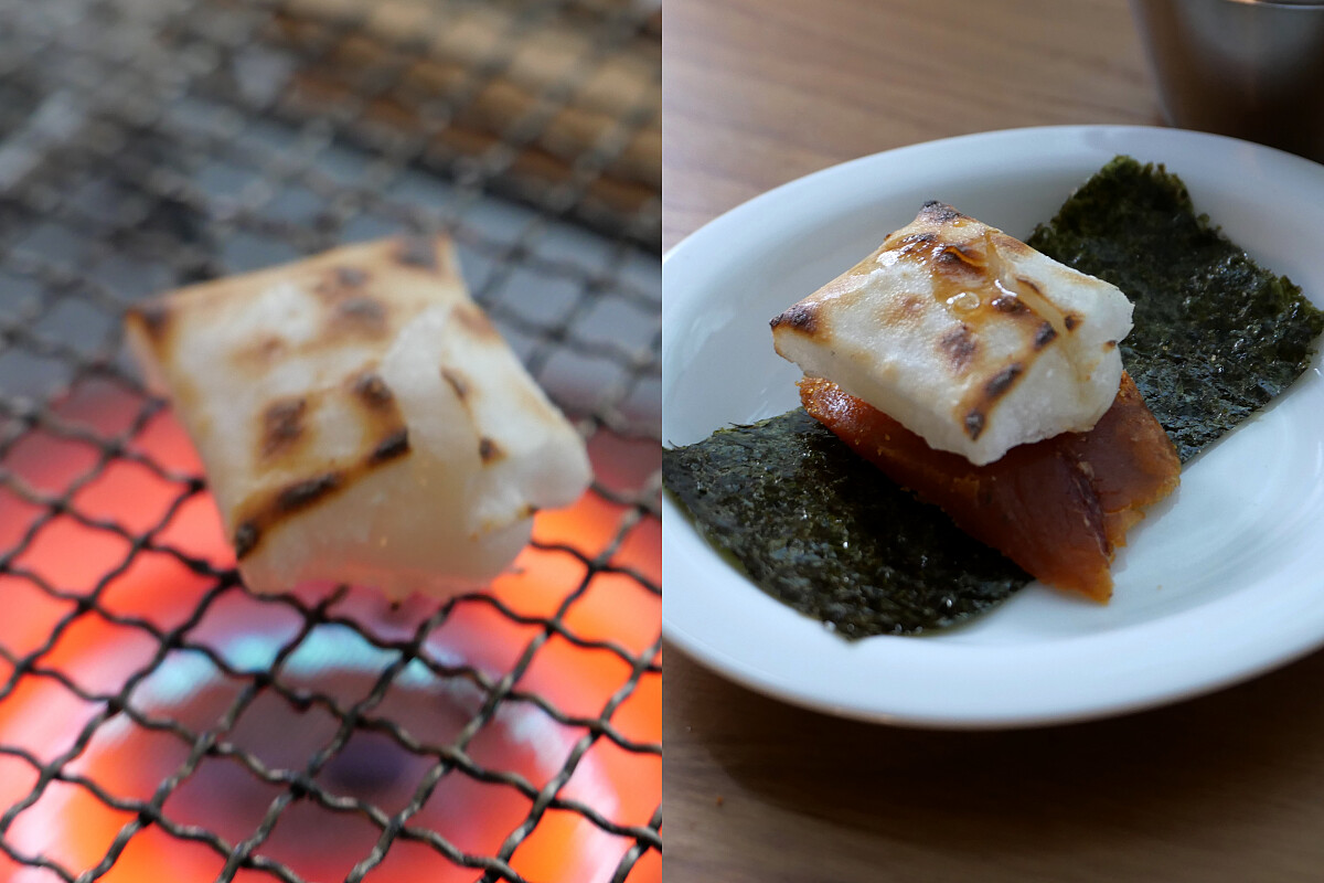 日式年糕以直火烤至表面焦黃膨脹,抹上一點醬油,與烏魚子、海苔包裹一起享用。