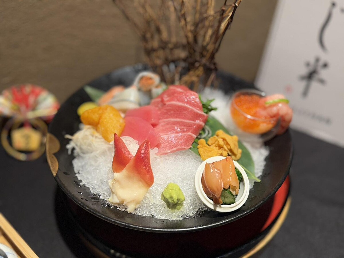 一次集結11道海味!從香檸佐胭脂蝦與魚卵開始,酸香與鮮甜先開胃;接著是赤貝、海膽、黑鮪魚腹肉與鮪魚赤身,油脂與清爽交替鋪陳;北寄貝的彈性、煙燻烏魚子干貝的鹹香、鮭魚的滑順、水針魚的Q嫩,再到紫蘇佐明太子花枝,層次清楚、節奏明快。這盤刺身不追求誇張堆疊,而是用食材本身撐起價值感,適合三五好友共享,也適合犒賞自己。