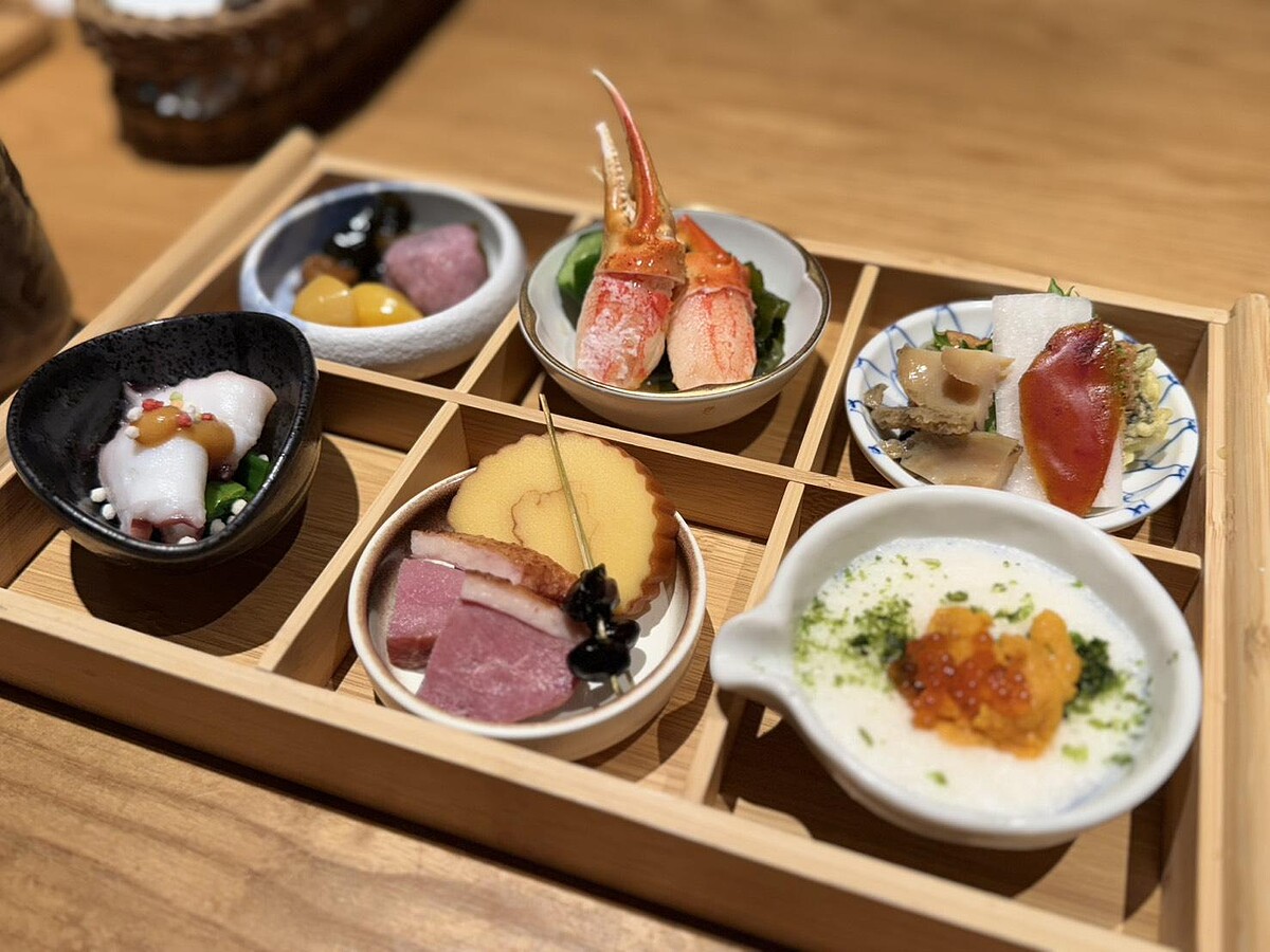 六宮格小缽呈現,風味安排有脈絡~第一格以昆布捲、櫻餅、黃金栗子揭開序幕,甜味象徵新年好彩頭。松葉蟹佐三杯醋凍帶出酸甜鮮味。穴子佐炸海苔、烏魚子蘿蔔、磯煮滷鮑魚則把海味推向高峰。海膽魚卵佐山藥泥讓口感在滑順與鹹香間取得平衡。伊達捲、燻鴨胸與黑豆組成的小缽三品,從綿密到煙燻,層次分明。最後以章魚佐柚子味噌收尾,清新而不膩,讓整套前菜有完整結構。