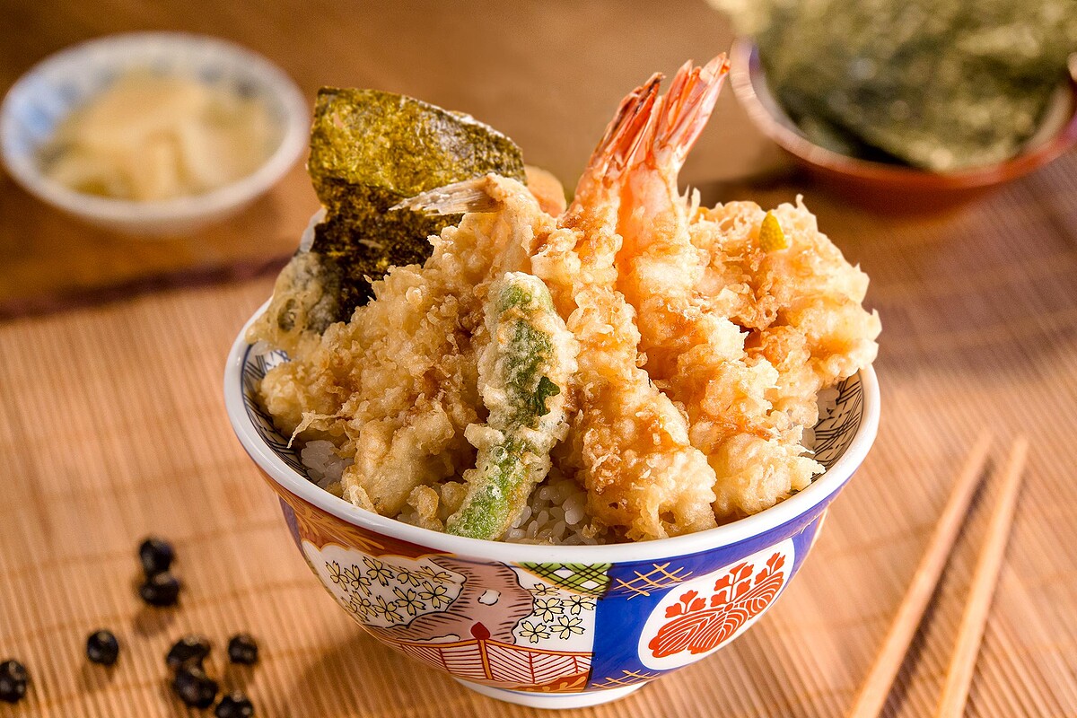 包含江戶前天丼、天丼與海苔一份,原價1076元,優惠999元。兩碗招牌天丼各有不同食材配置,醬汁鹹甜平衡,適合兩人分食。
