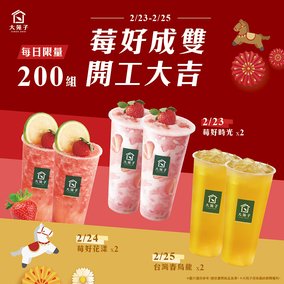 開工第一週,大苑子把草莓季的熱度延伸到辦公室日常,推出為期三天的「開工大吉.莓好成雙」活動。2月23日至2月25日,每天上午09:00於APP行動商城限量開賣雙杯組合,每日200組,主打分享概念與8折優惠。三天分別推出不同品項,從選用苗栗大湖草莓的莓好時光與莓好花漾,到茶香清雅的台灣春烏龍,節奏由甜入穩,剛好對應開工前三天的心情轉換。品牌長期強調台灣在地水果與茶葉特色,這一次以成雙成對的設計呼應開工好兆頭,也鎖定同事合購與分享情境。