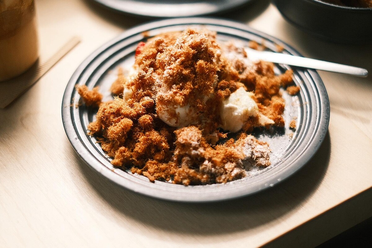 2022年登場的「草肉2.0」在這裡換上全新生乳酪版本,不同於初代以戚風蛋糕為基底,這次以依思尼白乳酪建立更紮實卻純淨的奶香架構,搭配台灣草莓鮮甜果香。白巧克力塔底提供酥脆支撐,刻意不完全拌勻的草莓鮮奶油保留自然紋理,最後鋪上金龍肉乾創始店的肉鬆,鹹香與莓果酸甜在口中交錯,層次清晰不雜亂。草莓肉鬆季約為每年11月中下旬至隔年3月下旬,實際供應仍視草莓品質與產量而定。