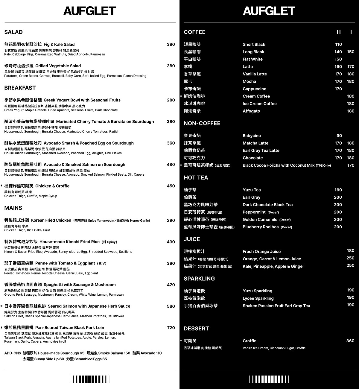 「AUFGLET」臺北店最大特色就是提供全日供應的限定早午餐,所有餐點皆由韓方親自設計,招牌為將甜食轉化為鹹食載體的「楓糖炸雞可朗芙」,讓可朗芙不再局限於下午茶甜點,而是與鹹食碰撞出驚喜的層次感,其鬆餅質地層次分明,外層酥脆到一咬即碎,內裡卻保有濕潤與彈性,奶油香氣在口中慢慢化開。
