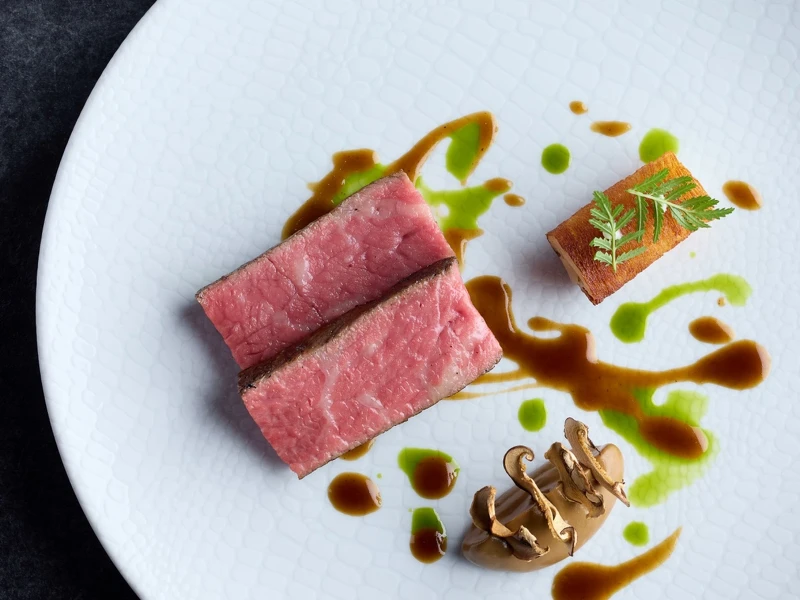 「馥郁|和牛、千層馬鈴薯、蕈菇、迷迭香」(主餐加價NT680升級)則提供和牛選項,需加價升級。現階段使用澳洲飼養的純血和牛,延續日本血統卻帶有較清晰的肉感,油花香氣仍在,但不顯膩口。牛排香煎後保留肉汁,搭配經典法式千層馬鈴薯,外層酥脆、內裡柔軟,奶香細膩。下方蕈菇松子泥與蕈菇牛汁交織出濃醇土壤氣息,最後淋上迷迭香油。