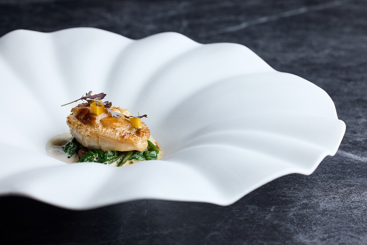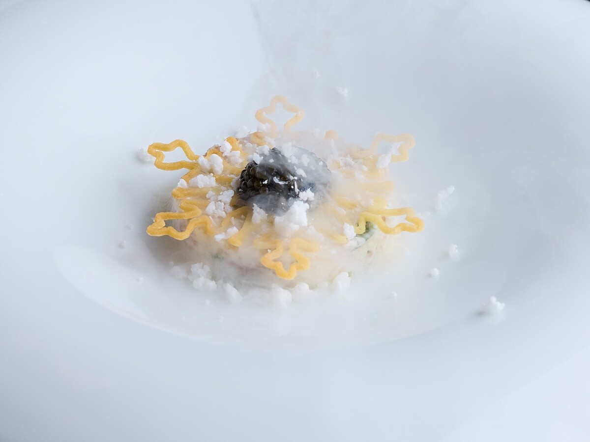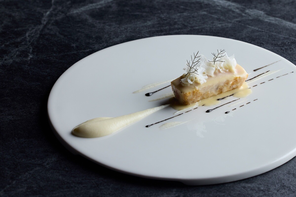 「霧息」描繪的是台灣冬日山間白霧瀰漫的景象。主廚選用當季油脂最飽滿的日本鰤魚,細切成丁,拌入新鮮蜜棗、芥末籽、干蔥與馬鞭草,做成清爽卻帶層次的生魚塔塔。蜜棗的脆甜與芥末籽的微辛讓魚肉顯得更立體,馬鞭草則添上一抹草本清香。上方鋪上 Oshetra 等級魚子醬,鹹鮮顆粒在舌尖釋放海味張力,再覆以一片雪花狀脆片,增添口感對比。桌邊最後輕灑以發酵蜜棗製成的「細雪」,微酸氣息隨之散開。Chef Pili 表示希望菜品呈現「冬天那種霧氣、大雪的感覺」,因此入口後明顯感受到脆、鮮、酸與草本香,形成一種清爽卻不單薄的結構。