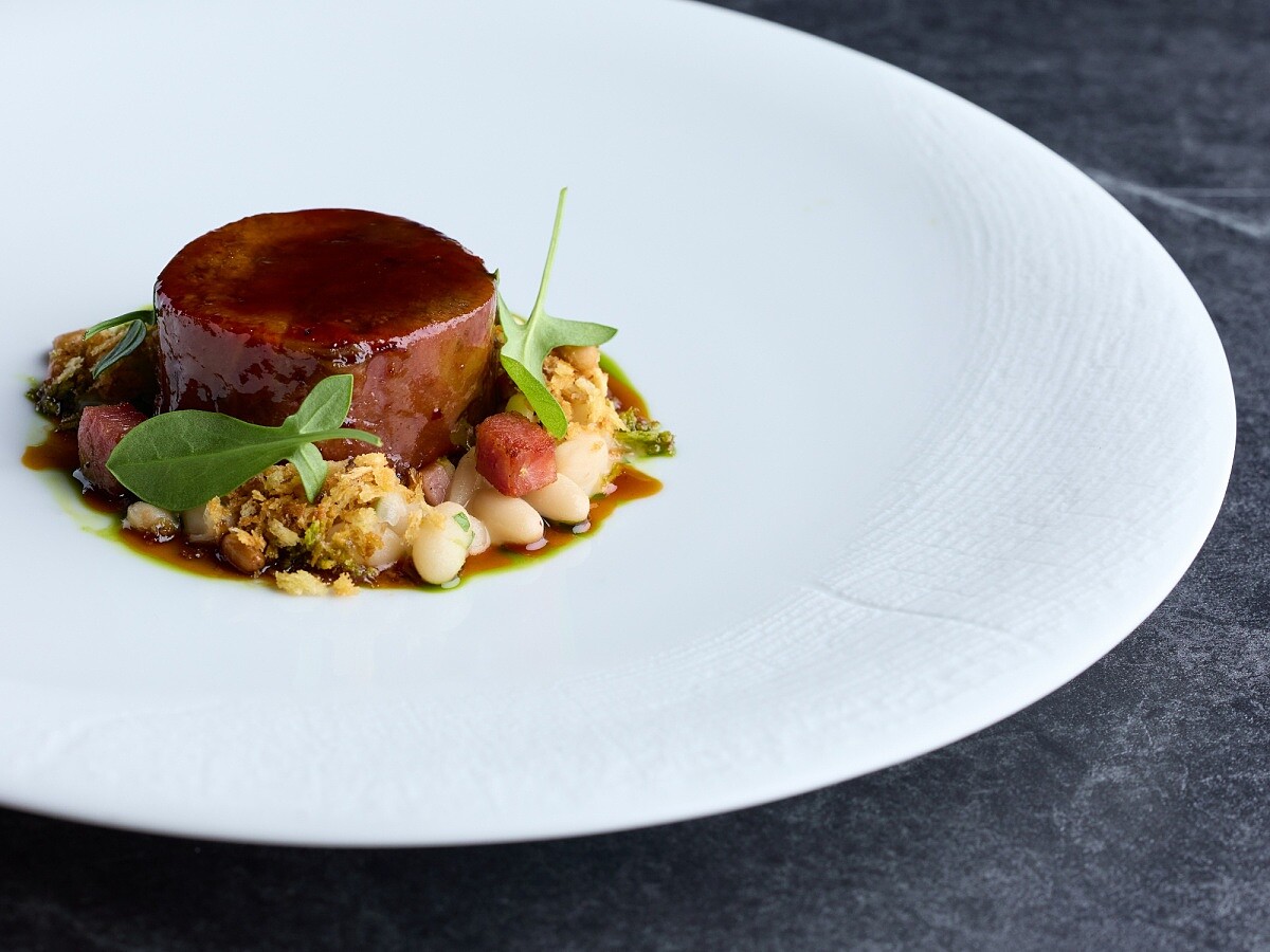 這道料理的起點,是南法冬季年末聚會常見的 Cassoulet(是一道來自法國西南部的經典燉菜,源自朗格多克地區,尤其以土魯斯、卡斯特爾諾達里與卡爾卡松一帶最具代表性)。主廚以此為靈感,將原本的香腸改為湖南臘肉,讓法式燉菜多了一層華人年節才有的煙燻風味。主食材選用整支澳洲和牛舌,小火慢燉至柔軟帶膠質,再捲起煎香定型,入口能感受到前中後段不同的彈與嫩。下方的白豆以雞高湯與鴨油慢燉,質地綿密厚實,承接牛舌的油潤與臘肉的鹹香。食用時「牛舌要跟白豆一起搭配」入口,才能感受到完整風味,最後撒上炒過松子的香料麵包粉與百里香油,讓草本氣息在濃醇之中多出一抹清亮,整道菜既保留傳統燉菜的結構,也融入熟悉的中式元素。