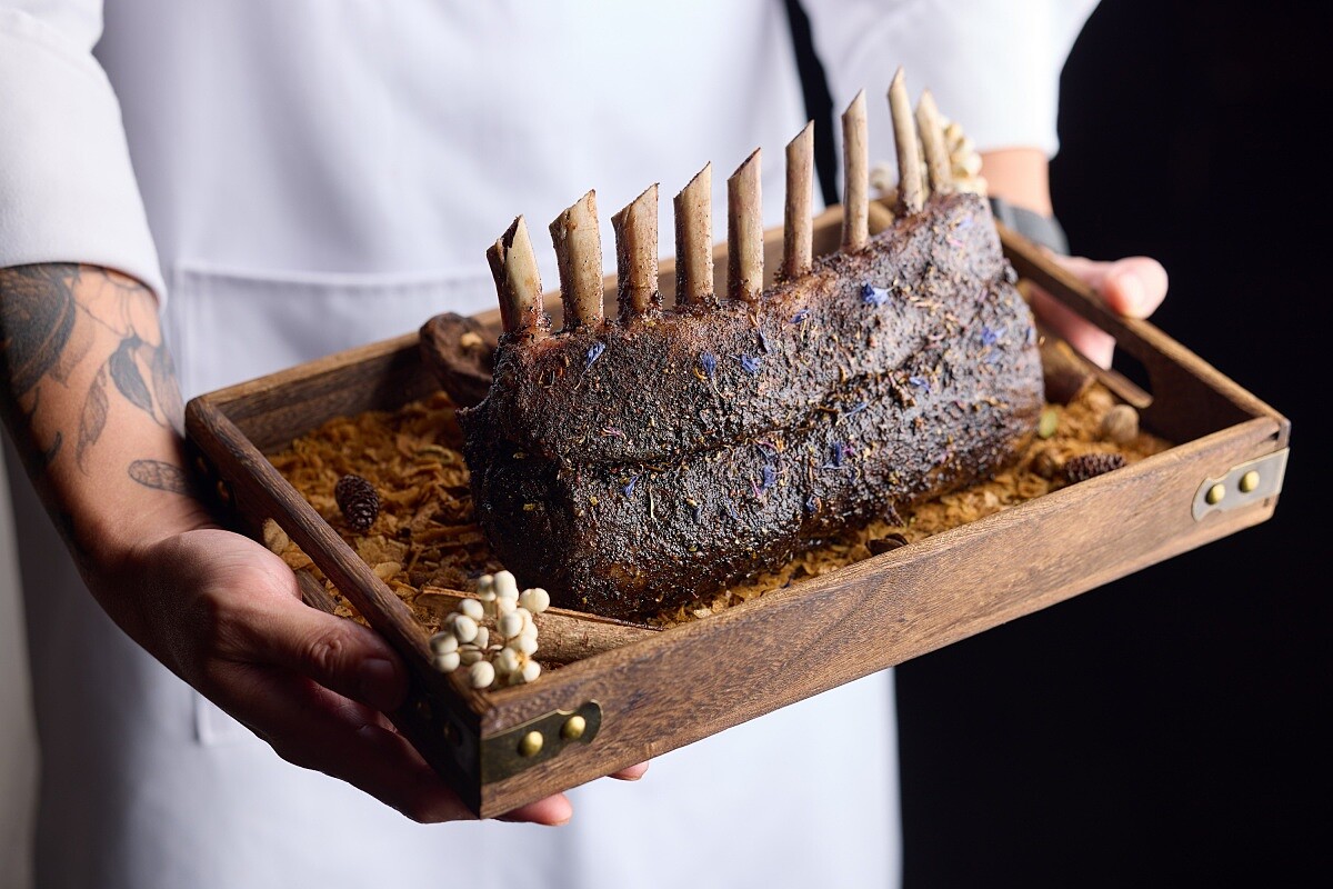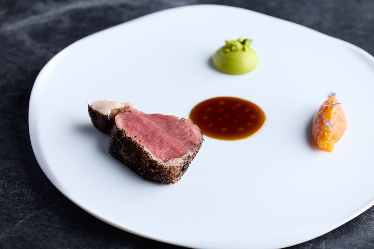鮑魚則展現他對氣味的細節,他特以類似紹興酒風味的法國黃酒入菜:「紹興酒是米釀,風味比較厚重直接;黃酒是葡萄釀製,尾韻會有淡淡的酸度,可以平衡醬汁的濃厚,最後還會留下葡萄的香氣,味道較為細緻。」主菜「暖香」同樣從冬日羊肉的記憶出發,取荳蔻、肉桂與茶葉等西式香料帶出暖意,杏桃醬與開心果泥負責平衡油脂。