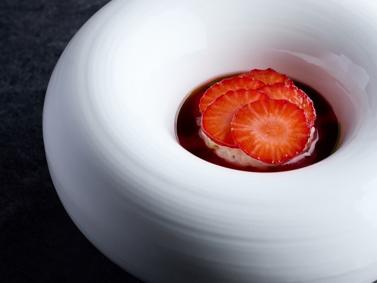 用當季台灣草莓,草莓下方是以七星米製成的米布丁,口感柔軟中帶著微微Q彈,溫潤不甜膩。醬汁以新鮮與發酵草莓熬製成草莓湯,帶出自然酸度,讓果香更集中,也讓整體層次更立體。最後淋上少量羅勒油,草本氣息在尾韻浮現。