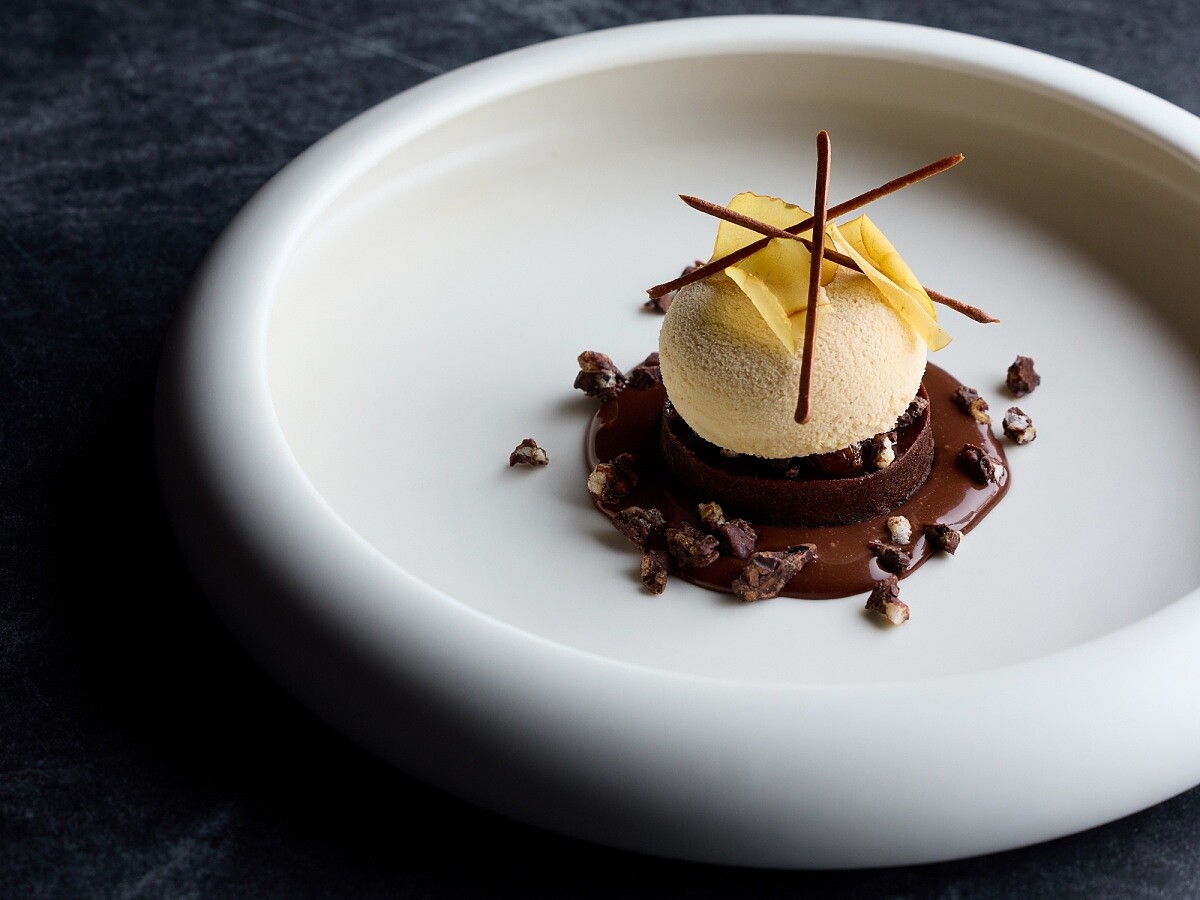 主甜點,栗子 Parfait 帶來近似冰淇淋般的滑順口感,堅果甜香沉穩展開。下方鋪陳威士忌風味的70%巧克力半熟蛋糕,溫熱流心與冷冽栗子形成溫冷對比。盤底巧克力醬融入正山小種茶湯,那種帶松煙氣息的古老紅茶,為整體添上一抹深色調。 酒漬葡萄乾與米香增加口感層次,也讓甜味不至單一。主廚建議從最上方一路切到底部,讓栗子、巧克力與茶香在口中交融。尾韻微苦,帶著淡淡茶氣與可可香,像炭火燃盡後仍留在空氣裡的餘溫,為整套冬季菜單畫下沉穩完美的句點。