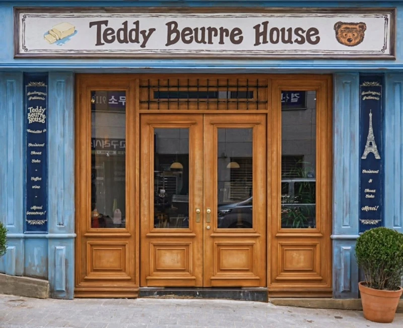 近年在首爾爆紅的Teddy Beurre House,由出身米其林三星餐廳體系、參與料理節目《黑白大廚》第二季的主廚金勳Kim Hun所創立。品牌以法式鄉村小鎮風格空間、療癒泰迪熊形象,深受年輕族群喜愛。其各式可頌以傳統法式工藝為基礎,再依亞洲市場的口味調整配方比例,並選定法國Lescure奶油作為核心原料,透過傳統法式摺疊工藝與精準控溫技術,打造外層金黃酥脆、內層蜂巢孔洞結構的可頌麵體,奶油香氣濃郁卻不膩口,也因此被韓國網友封為「三大可頌名店」之一。