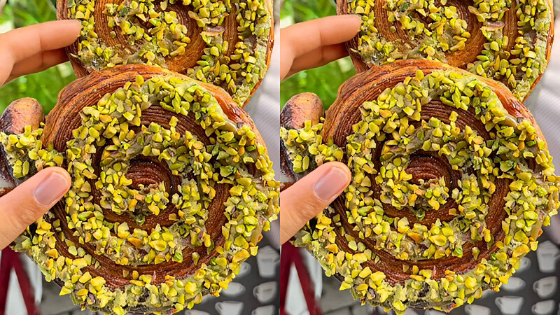 口味包含杜拜巧克力、杏仁奶油、瑪格麗特與美式臘腸。其中話題王「杜拜巧克力可頌」,金黃酥皮包裹著濃厚的堅果與巧克力內餡,切開瞬間視覺感十足,堅果油脂香與微苦可可完美平衡,是韓國社群熱門打卡選項。