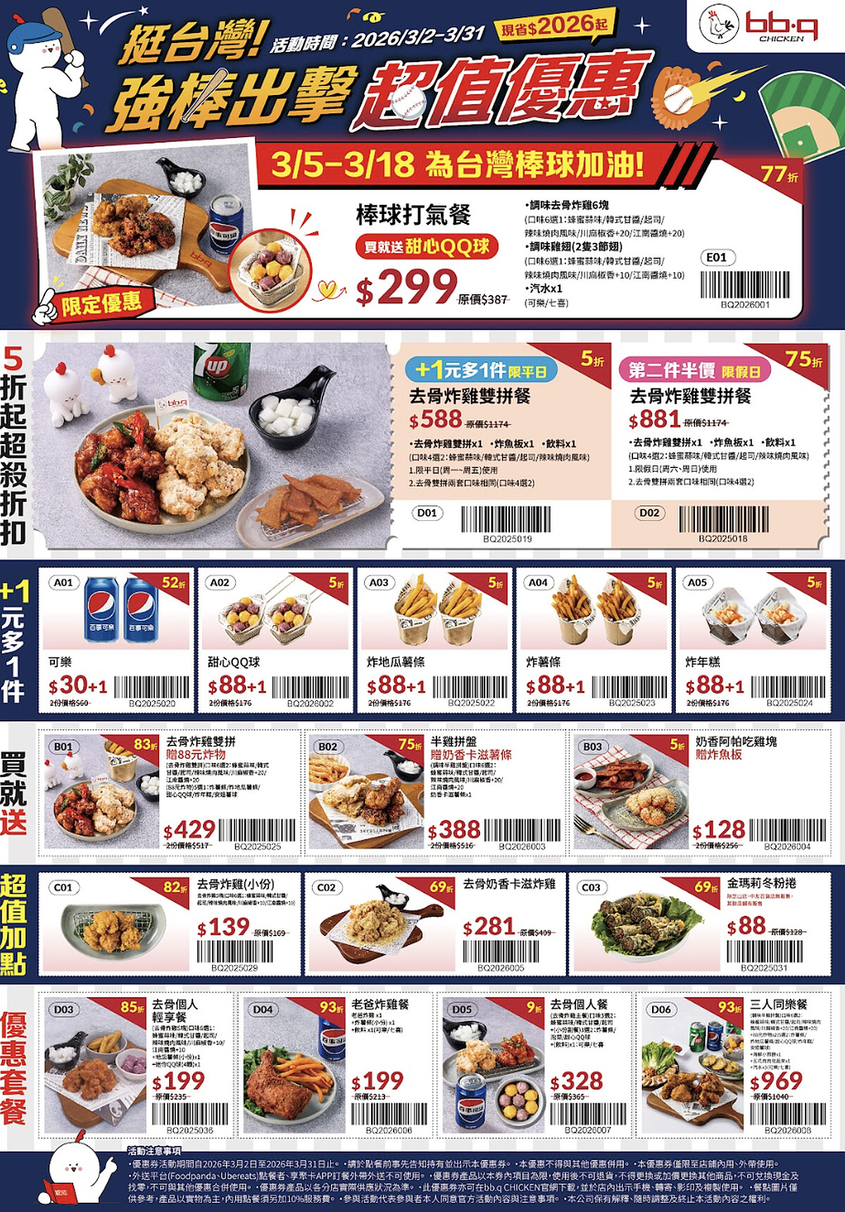 韓式炸雞品牌bb.q CHICKEN於3月2日至3月31日推出為期30天的「挺台灣!強棒出擊超值優惠」。主打299元「棒球打氣餐」,並祭出指定餐點「+1元多1件」方案,活動期間不限次數,內用或外帶出示優惠券圖示即可享優惠。對炸雞控來說,這是一段幾乎整個賽季都能用的加碼。