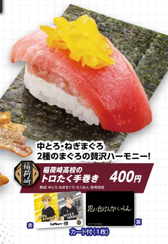 本次聯名最受矚目的視覺亮點,莫過於各校人氣角色穿上藏壽司工作服的造型,角色包含烏野的日向、影山、月島、音駒的研磨、黑尾、夜久、梟谷的木兔、赤葦、木葉,以及稻荷崎的宮兄弟與北信介,通通化身Q版的藏壽司店員。
