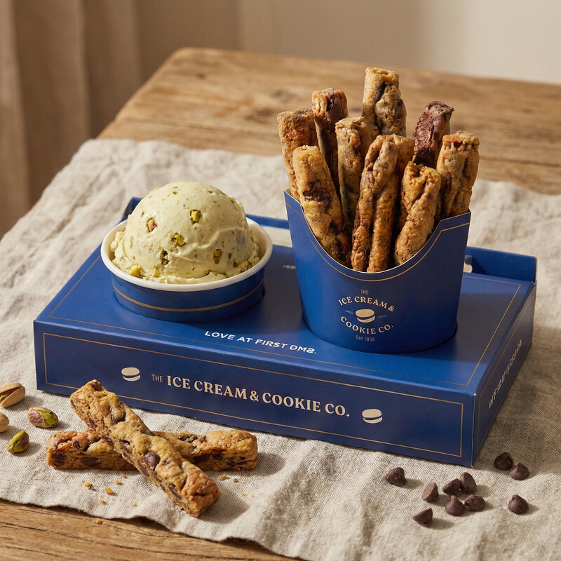 在台北信義區統一時代百貨B2登場的The Ice Cream & Cookie Co.概念店,其中最受關注的當屬全球首發新品 「冰淇淋配薯條餅乾」(售價$188)。這款顛覆傳統的甜點,將圓形軟餅乾變身為類似薯條造型的長條餅乾,再沾上冰涼香濃的冰淇淋,形成強烈對比口感,讓人一口接一口停不下來。