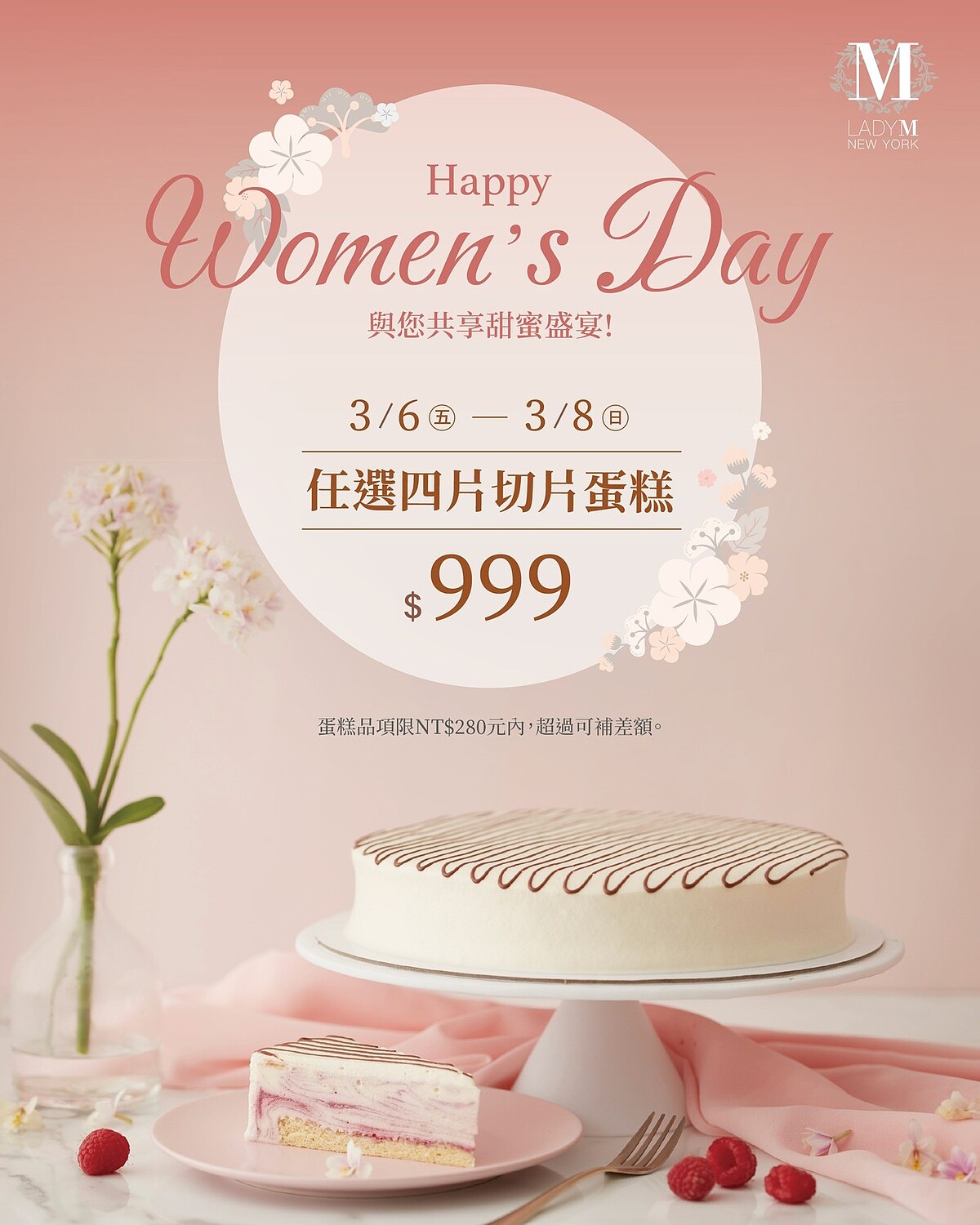 人氣蛋糕品牌Lady M推出限時三天的女神專屬優惠,3月6日至3月8日,女性顧客外帶任選4片切片蛋糕(單價280元以內,超過可補差價),即享優惠價$999元,每人限購一組,買越多省越多,甜點控千萬別錯過。