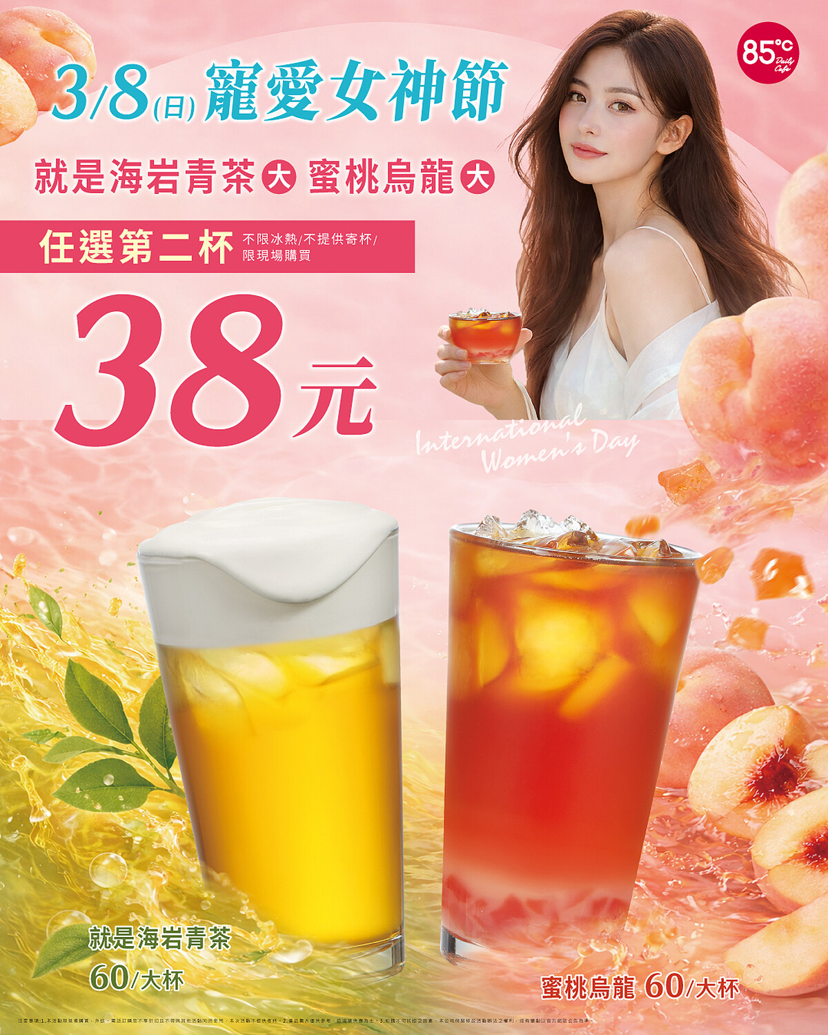 85℃推出指定大杯飲品「蜜桃烏龍」與「就是海岩青茶」第二杯只要$38元,不分冰熱,限門市購買。此外,3/5~3/17透過85 Cafe APP可領取「大杯蜜桃烏龍買一送一」電子券(限量10,000張),兌換期限至4/5。