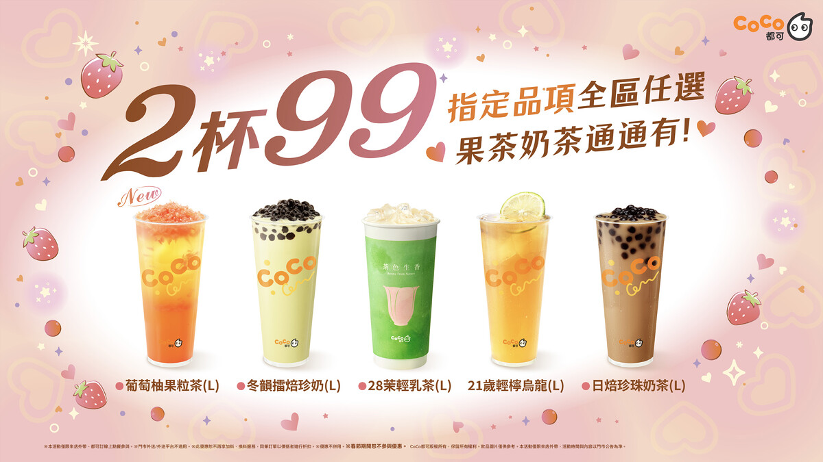 CoCo都可在3月8號當天,「粉角奶茶」第二杯特價$38元,3/5起更加碼葡萄柚果粒茶、28茉輕乳茶、日焙珍珠奶茶、21歲輕檸烏龍、冬韻擂焙珍奶任選兩杯只要$99元,粉絲快約好友一起喝手搖,天天都能享優惠!