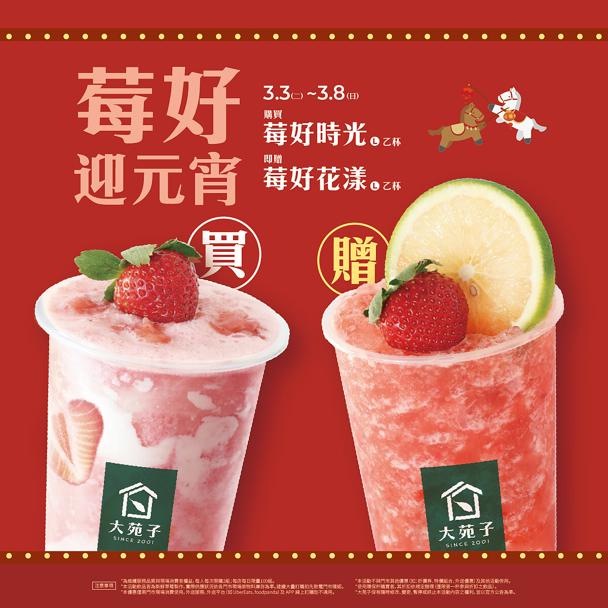 大苑子即起至3/8凡至全台門市購買大杯的「莓好時光」,即可免費送大杯的「莓好花漾」一杯,每店每日限量供應。使用台灣本地大湖草莓製作,酸甜果香融合茶飲。