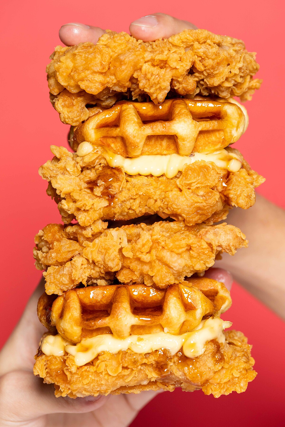 內層則夾入深受喜愛的厚實比利時格子鬆餅,鬆軟的口感與咔啦雞腿排的強烈肉感形成絕妙對比,最後再淋上香甜的楓糖醬收尾 。甜與鹹在口中交織堆疊,完美呈現外酥內軟、甜鹹交疊的立體風味層次。