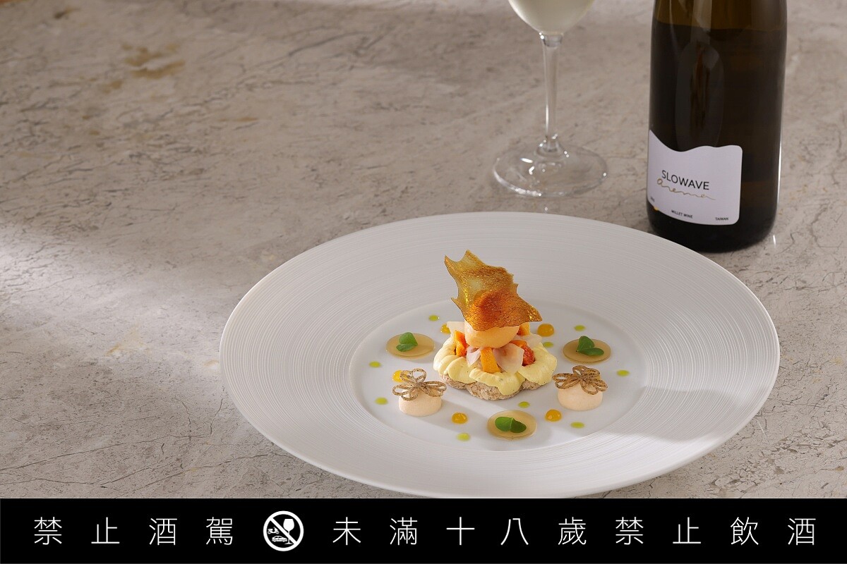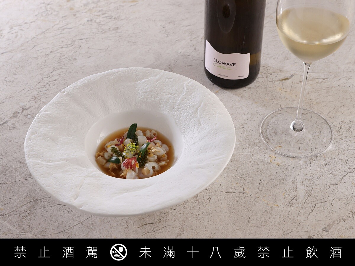 與多數餐酒搭配不同,此次菜單並不是「先完成料理,再尋找合適的酒」。整體餐桌設計反而是從粟酒出發,讓酒的酸度、香氣與穀物質地,反向影響料理的節奏與風味安排。酒不再只是餐桌旁的陪襯,而是整體用餐體驗的骨架。從開場到尾韻,每一款粟酒都被安排在不同段落,形成一條完整的味覺軌跡。SLOWAVE 創辦人 Hayden 表示,他們關注的從來不只是釀出具有地方風味的酒,而是思考這樣的酒,能否真正進入餐桌語境:「粟酒對我們來說,不是復古符號,也不是替代品,而是一種來自臺灣土地的發酵語言。」
