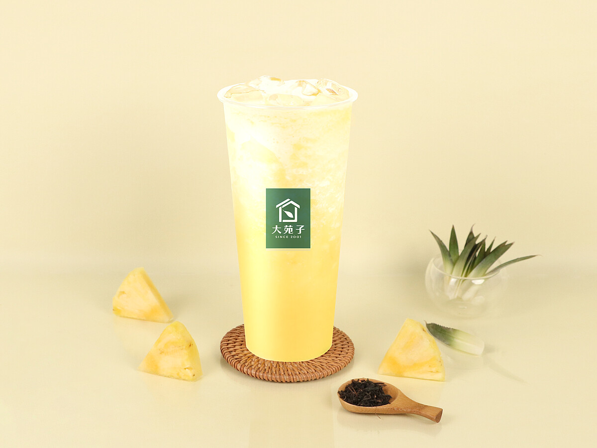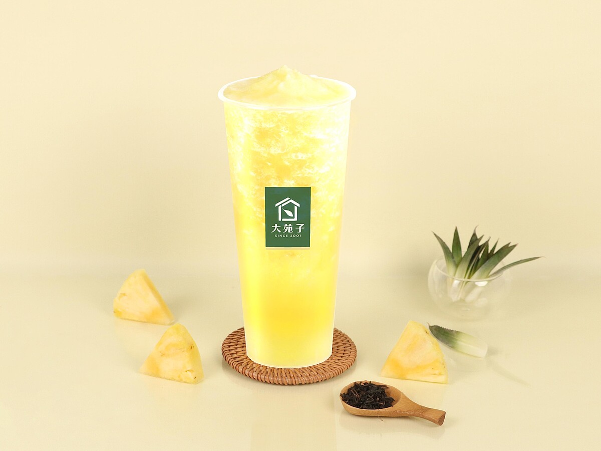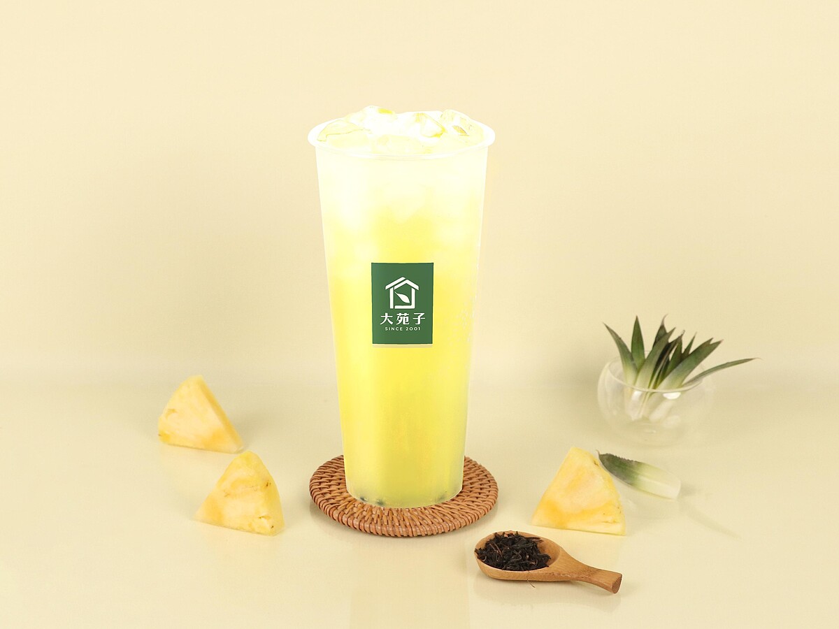鳳梨的風味決定整杯飲料的靈魂,這一次選用的台農17號金鑽鳳梨本身甜度高、纖維細緻,入口幾乎沒有粗糙感,香氣也比較乾淨明亮。這款鳳梨長期是台灣外銷日本的重要品種,穩定度與品質都有一定水準。大苑子直接以新鮮鳳梨打成果汁使用,讓整體風味維持在最接近水果本身的狀態。對常喝手搖的人來說,會很明顯感受到那種剛切開水果的清新氣息。