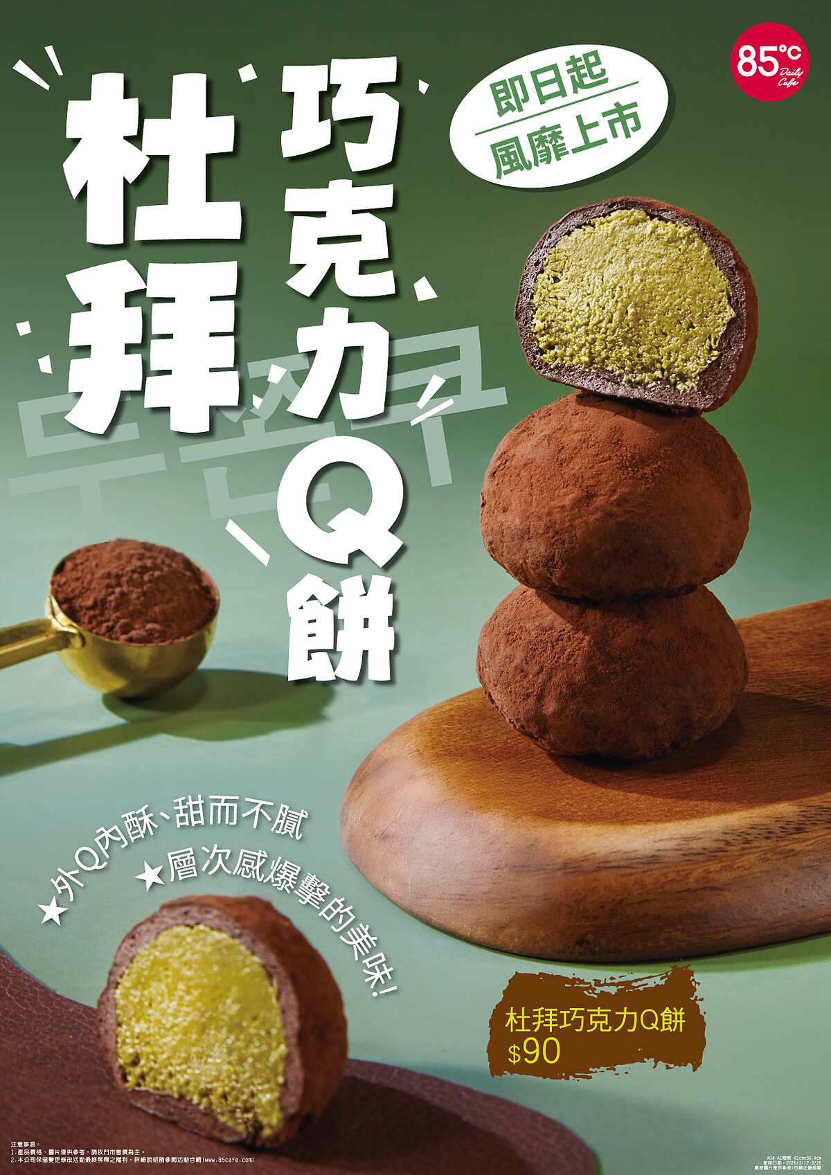 85°C成功將這股異國風潮轉化為更親民、更具在地特色的版本,「杜拜巧克力Q餅」單顆售價90元,在保留中東甜點靈魂的同時,更融入品牌引以為傲的口感實驗。