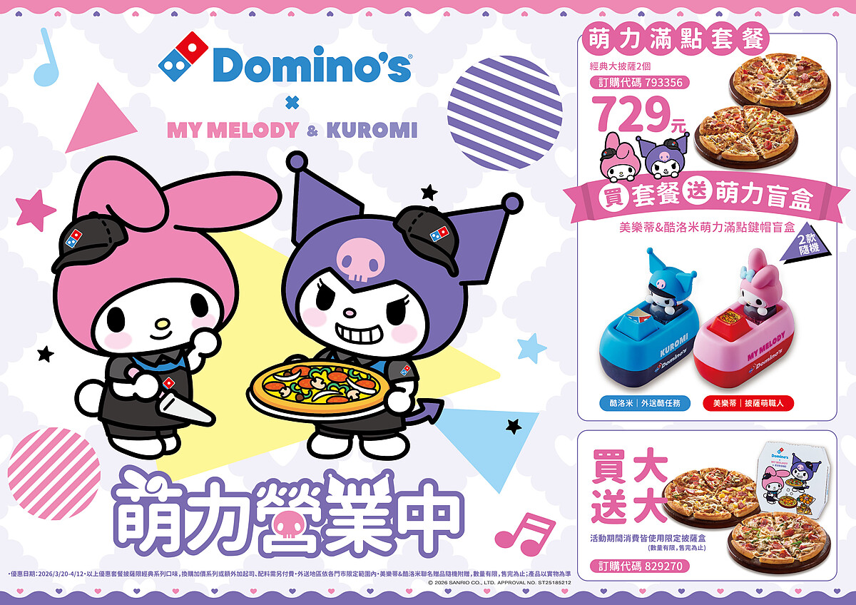 為了讓粉絲一次蒐集美食與限量周邊,達美樂自即日起至4月12日止,於全台門市同步推出「萌力滿點套餐」,套餐售價$729元,內含2個經典系列大披薩,並加碼隨機贈送「萌力滿點鍵帽盲盒」1個,訂購代碼:793356。此外活動期間訂購達美樂任一口味大披薩或聯名套餐,還能獲得美樂蒂與酷洛米限定版披薩盒,讓粉絲在開箱美食前就先被可愛爆擊。達美樂也貼心提醒,所有聯名套餐、限定包裝及盲盒皆為數量有限、售完為止。