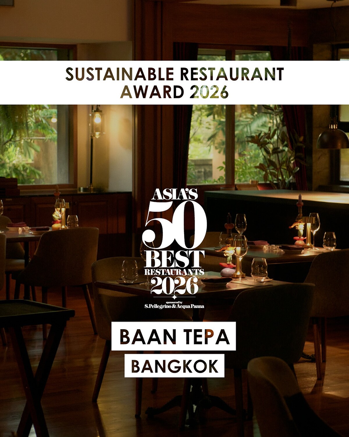此外,曼谷的「Baan Tepa」(No.53)獲頒「可持續餐廳獎」(Sustainable Restaurant Award)。「Nusara」主廚 Thitid ‘Ton’ Tassanakajohn 也獲得「廚師之選獎」(Inedit Damm Chefs' Choice Award)。