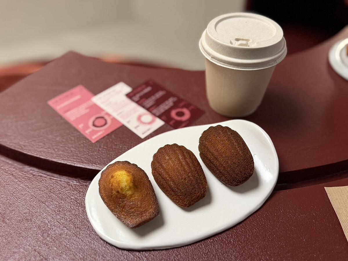 這裡設計了一種接近體驗的消費方式,只要點一杯咖啡或茶,就能現場選一款瑪德蓮試吃。剛出爐的瑪德蓮外層微微酥脆、裡面柔軟濕潤,跟冷掉之後的口感差異非常明顯。這樣的安排讓客人能直接感受到它最理想的狀態,也讓購買過程多了點互動的樂趣。門市更打造成劇院的感覺,站著品嚐剛出爐的瑪德蓮,無論是和朋友一起還是獨自享受都超級幸福。如果可以喝咖啡的話,小編大推椰子咖啡,真的超級順口~