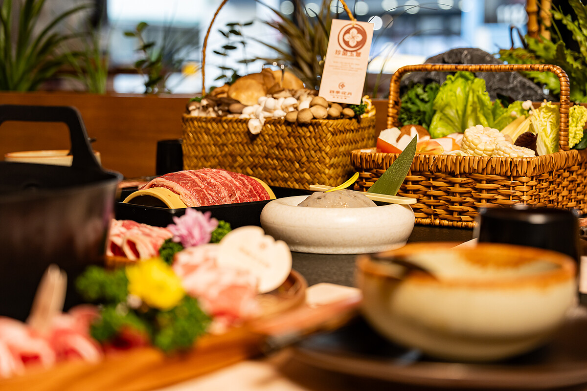 火鍋好不好吃,肉當然是重點。四季花月最吸睛的就是「山野肉花圈」,不是一般平鋪式肉盤,而是沿著鍋邊環狀擺放,像花圈一樣把鍋圍起來,拍照效果強,桌上氣勢也很足。肉品選擇涵蓋日本A5和牛紐約客、日本A5和牛嫩肩、美國牛小排、西班牙伊比利豬梅花、紐西蘭小羔羊與益活去骨雞腿等,另外也設計出三種肉花圈組合。偏愛牛肉的人可選「山野一圈‧牛」,一次吃到美國牛板腱、美國雪花牛與美國牛小排,想牛豬一起吃則有「山野雙圈‧牛豬」。選擇障礙最適合直接點「山野三圈‧牛豬羊」,兩牛、兩豬、一羊一次到桌,每份肉花圈也都會附上四季鮮蔬籃。另一道必吃菜色非「9秒牛肉」莫屬,主廚把板腱牛做成超薄切片,再以不同醃料處理,強調只要在沸騰湯底裡涮9秒,就能吃到最佳口感。口味共有4種,包括帶辛香感的「鮮辛山葵」、香氣先到位的「珍馥松露」、麻辣派會喜歡的「焰麻烈辣」,以及用沙姜調味的「山奈沙姜」。