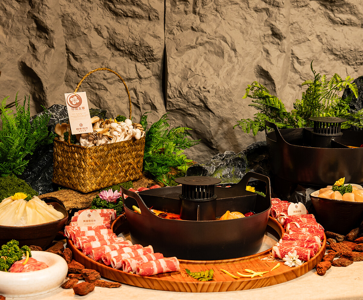 四季花月開幕就端出9款湯底,包含2款紅鍋、7款白鍋,口味橫跨麻辣、酸香、濃郁與清甜,選擇相當完整。基本款有滑順不膩的「香醇牛奶鍋」、提鮮解膩的「番茄果香鍋」,以及以雙湯熬煮的「胡椒豬骨雞鍋」,都是接受度高、也容易入門的品項。特色鍋底則有像是以南瓜結合酸菜與雞湯熬煮的「酸爽金湯鍋」,帶著先酸後甜的風味,入口很快就能把味蕾打開。還有以雲南羊耳菌入鍋的「山珍松茸鍋」,走的是鮮甜清潤路線。喜歡南洋風味的人可以選「酸辣冬陰功鍋」,而以100%純椰子水搭配雞湯熬煮的「椰香益活雞鍋」是清爽派會想點的一鍋,它的椰香不會厚重,和雞湯搭在一起有種乾淨的甜味,尤其適合搭配辣鍋交替著吃,這也是小編實際品嚐後最喜歡的湯底。