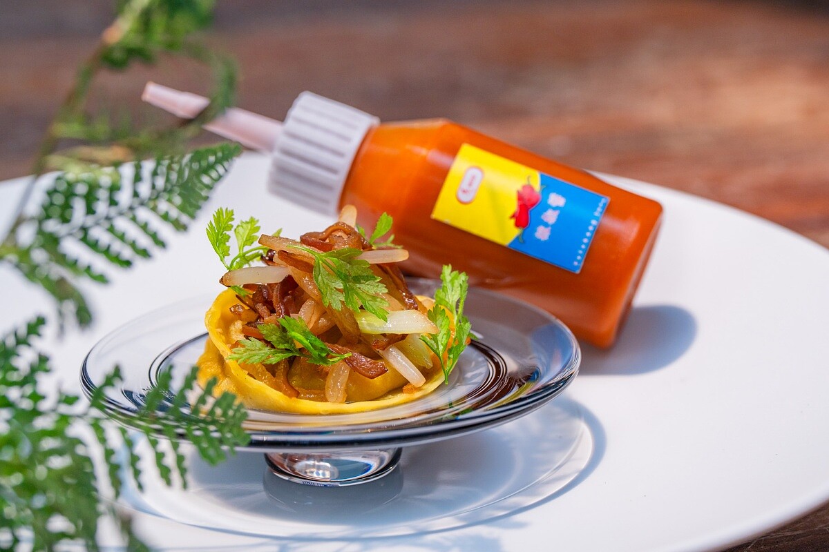 這道料理源自 Chef James 在臺中成長的記憶。學生時期常吃的洋蔥麵,搭配東泉辣椒醬,成為他對日常風味的起點。這次他將這樣的味道重新轉化,以陽春麵的結構為基礎,將豬油、醬油與蔥的風味濃縮進一顆義大利麵餃中。內餡以豬澄清高湯與韭黃構成,並加入熟成風乾的豬背脂提升層次,搭配豆芽與韭黃帶出清脆口感。 “TCL”代表 Taichung Love,取材自東泉辣椒醬,改以醃漬番茄與自家泡椒重製為酸甜辛香的辣醬,並以獨立形式提供,讓風味可依個人口味調整。這道菜也延續 James 與 Steve 八年前四手餐會的創作脈絡,將記憶與技法收斂為更精準的一口。